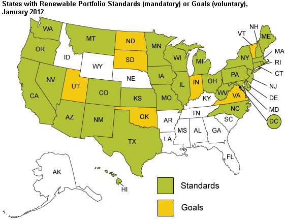 A Renewable Portfolio Standard (RPS) or Renewable Energy Standard typically requires companies selling electricity to end-use customers to generate or purchase a specific percentage of its energy from renewable sources. If a seller fails to procure sufficient renewable energy, it must pay penalties. As shown in the map, 29 States and the District of Columbia have an RPS. Seven states have adopted voluntary goals, which provide incentives to utilities that choose to procure renewable energy or do not penalize utilities that fail to meet the State’s target.